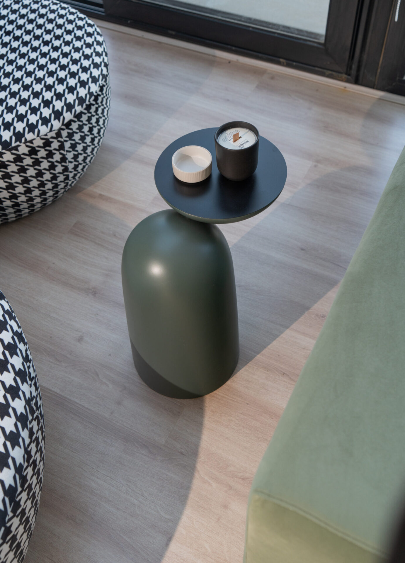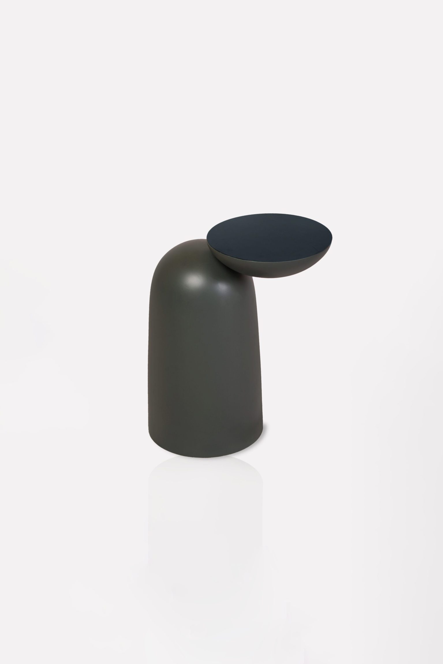 This beautiful tabouret features a rounded cone shape, minimalist structure in wood, while the finish is divided into two sections, one of which is in lacquered sage green finish and the table top is in electrostatic painted metal. This piece can be used on its own or along with other items from the same collection. All Casa products are handcrafted for you.