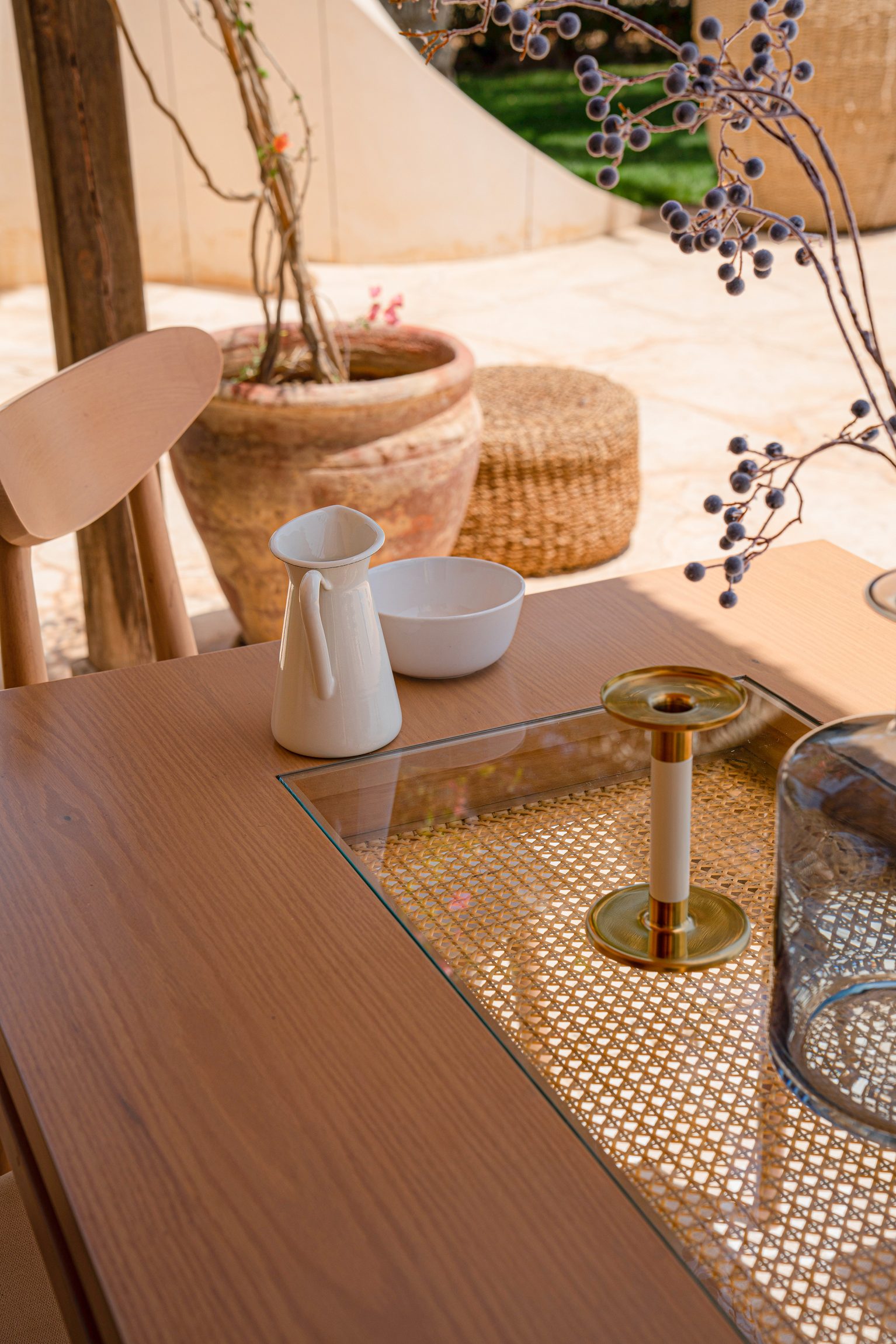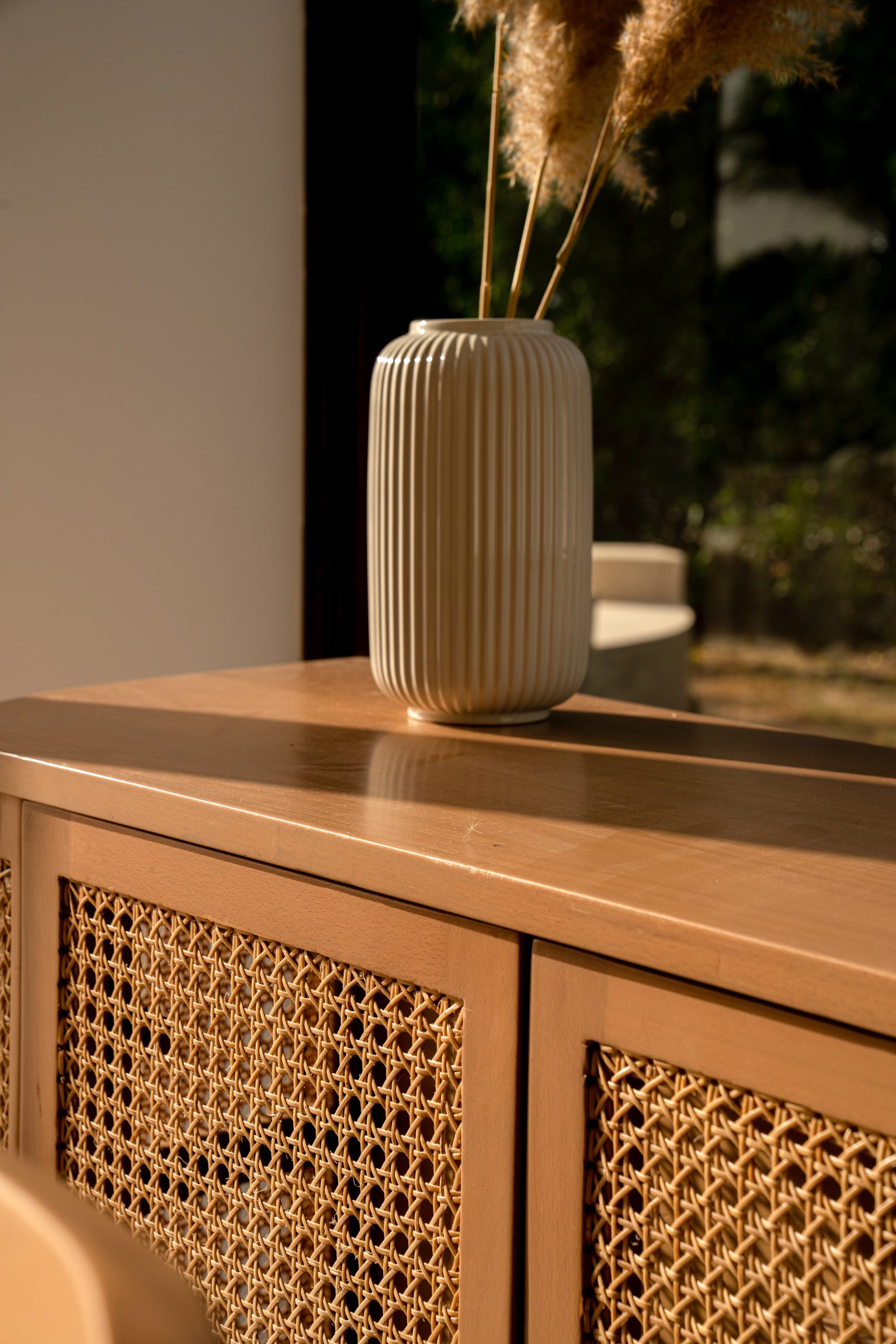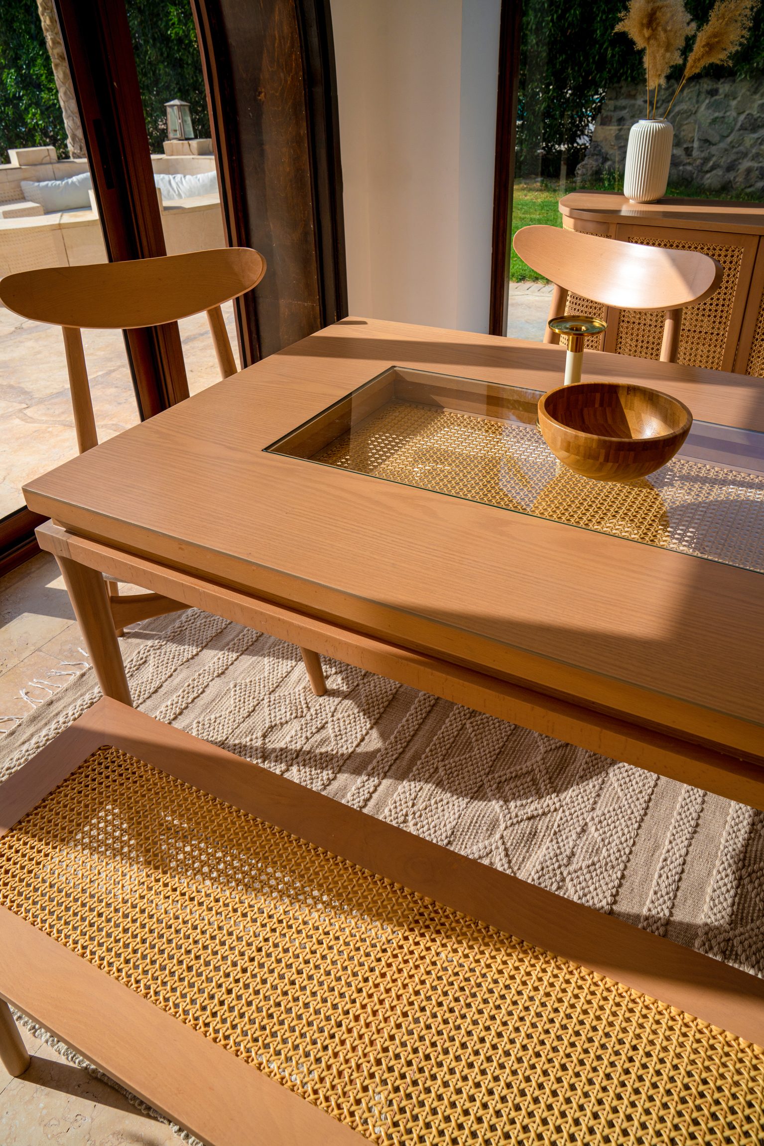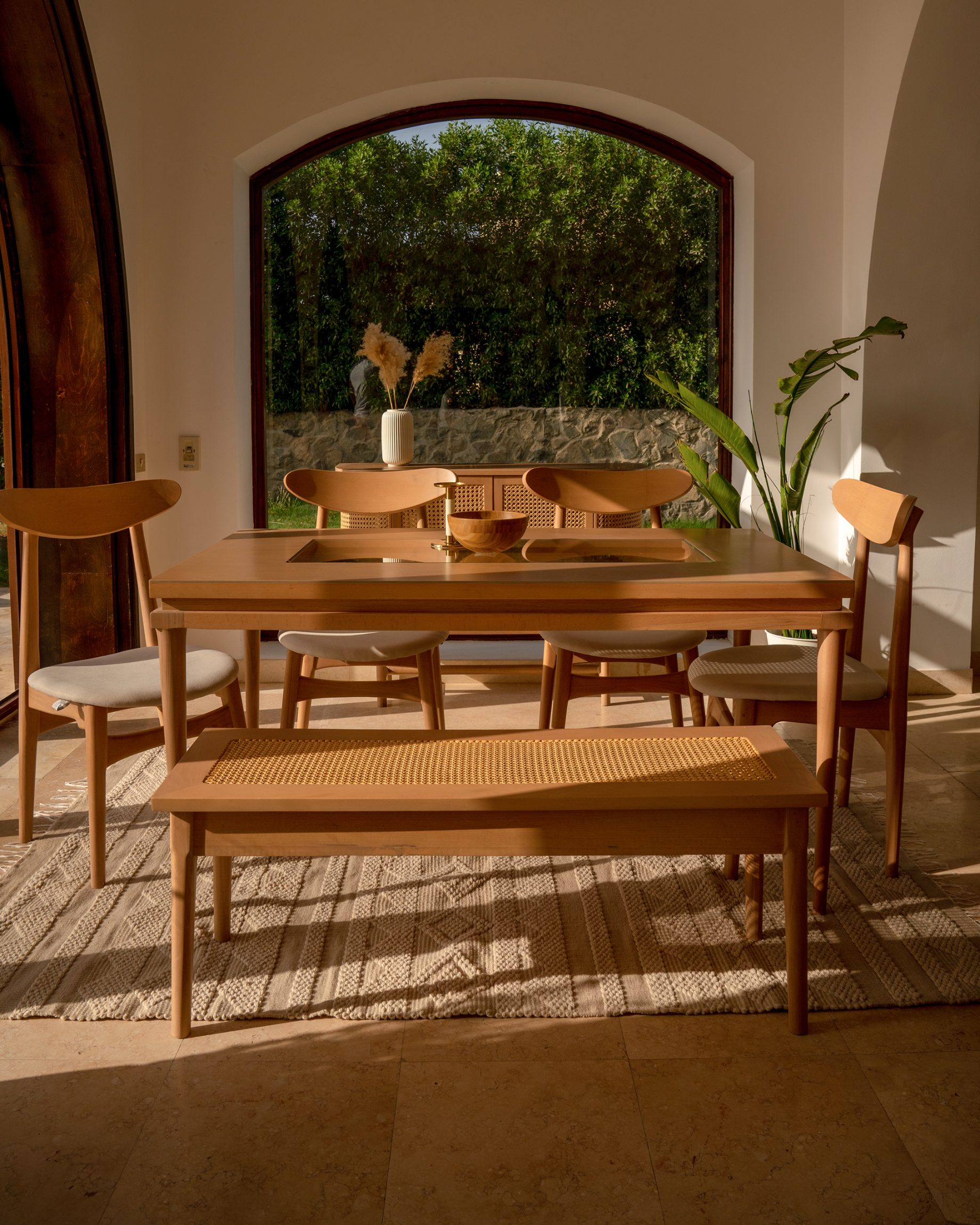 With everything you need to build the perfect dining room, this set will free you up to focus on the most important thing: dinner! Made from beech wood and cane, the 4 chairs have a light oak finish and foam-filled, cotton seat. Stitched accents add a tailored touch, and the solid color upholstery is easy to pair with a variety of different color palettes. The cane table and bench have a clean-lined rectangular silhouette and a light finish that complements a variety of different aesthetics and styles.